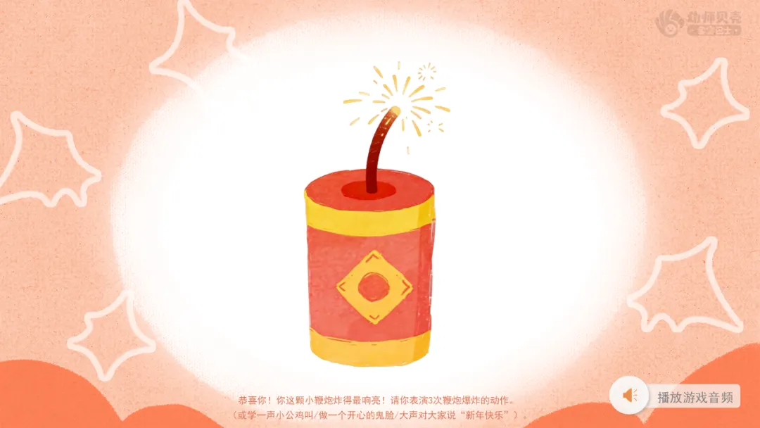 ——恭喜你!你这颗小鞭炮炸得最响亮!请你表演3次鞭炮爆炸的动作。(或学一声小公鸡叫/做一个开心的鬼脸/大声对大家说“新年快乐”)。
