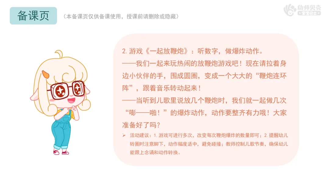 Ø活动建议:1.游戏可进行多次,改变每次鞭炮爆炸的数量即可;2.提醒幼儿转圈时注意脚下,动作幅度适中,避免碰撞;教师控制儿歌节奏,确保幼儿能跟上念诵和动作转换。