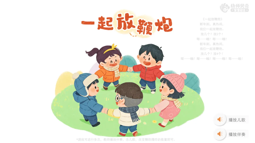 ——当听到儿歌里说放几个鞭炮时,我们就一起做几次“嘭——啪!”的爆炸动作,动作要整齐有力哦!大家准备好了吗?
