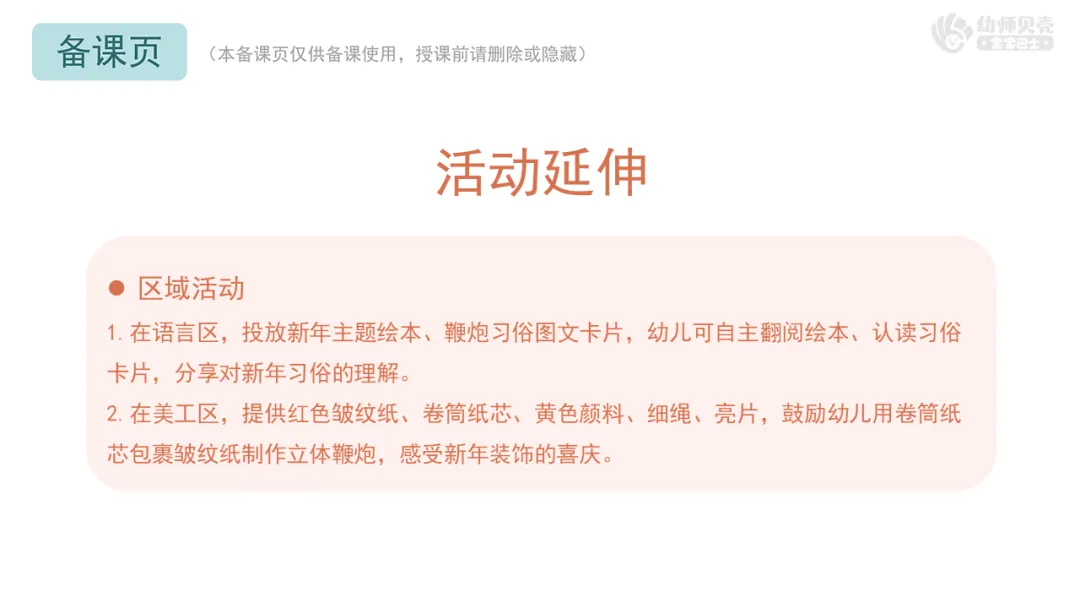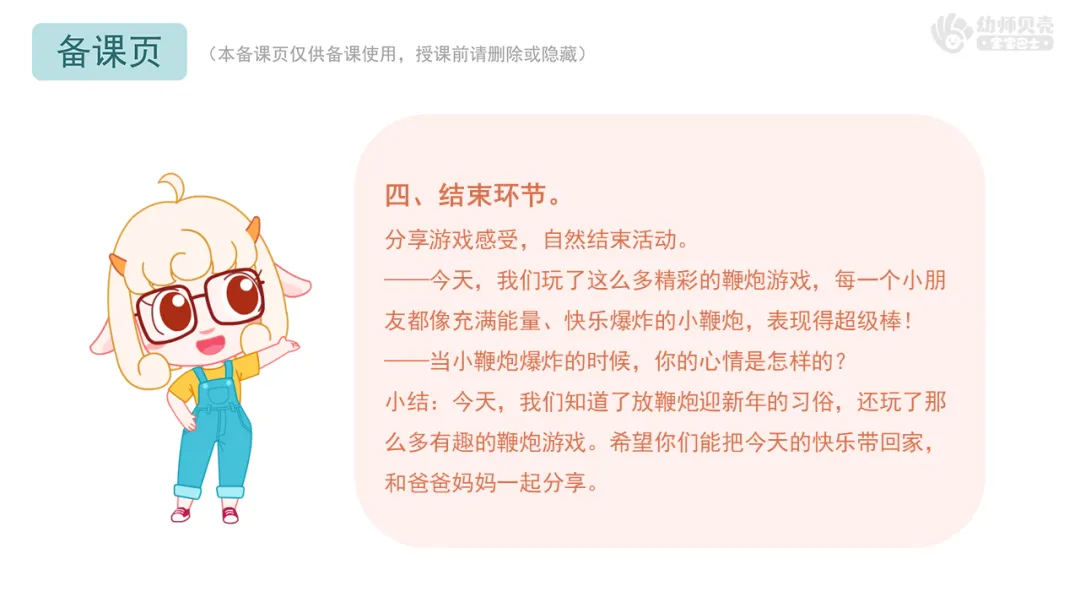 小结:今天,我们知道了放鞭炮迎新年的习俗,变成了最棒的小鞭炮,玩了那么多有趣的鞭炮游戏。希望你们能把今天的快乐带回家,和爸爸妈妈一起分享。