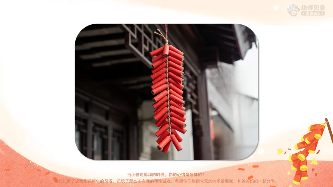 ——听,这是什么声音?你们在什么时候经常听到这种热闹的声音?(鞭炮声;新年)