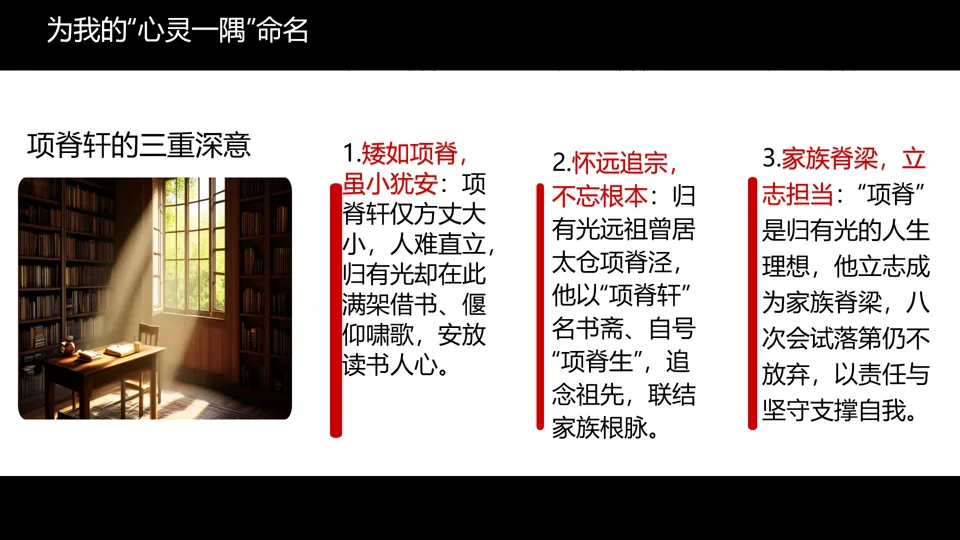 设计意图:从归有光命名“项脊轩”的三重深意入手,为学生树立命名范例;引导学生思考自己命名的多重内涵;为后续“我的项脊轩手记”的创作提供真实的情感起点。