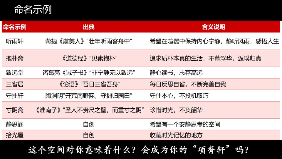 命名活动中学生觉得“无话可说” | 提供命名示例库;允许先用“暂定名”,后续随着项目推进再修改;鼓励从“功能”入手(如“静思斋”“观书堂”),再逐步深化内涵。 |