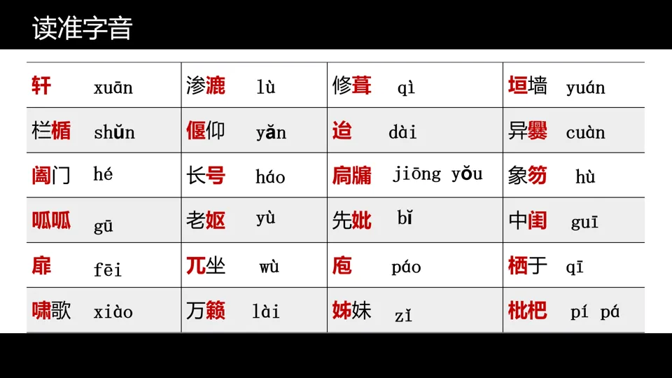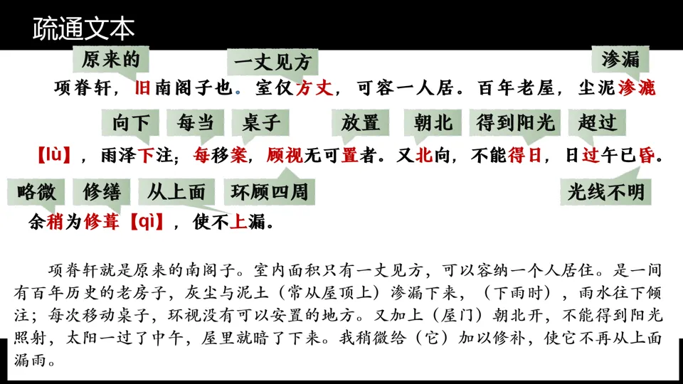 朗读《项脊轩志》全文,借助注释初步疏通文意,圈画读不准的字音和不理解的字词。