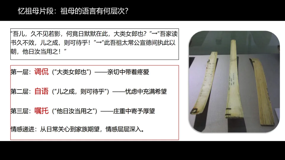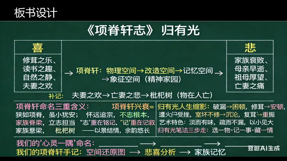潜在误区:学生可能将归有光的“平淡”理解为“单调”,忽略其“淡而有味”的艺术匠心;也可能只看到表面的“悲喜”,而未能理解背后的时代背景与人生境遇;还可能误认为“志”就是“记”,忽略“铭记”的深层含义。