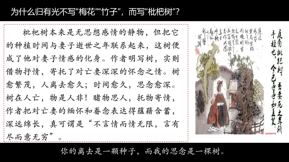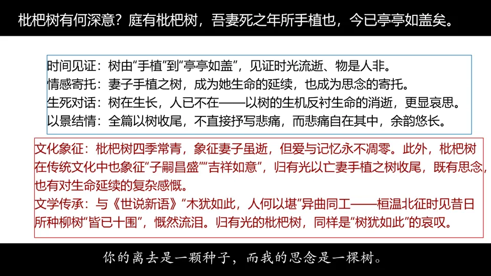 “庭有枇杷树,吾妻死之年所手植也,今已亭亭如盖矣。”(前句低沉,后句渐缓,余韵悠长)