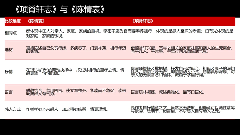 《陈情表》 | 忠孝难两全,情理交融 | 比较“忠孝”与“亲情”的表达方式;比较两篇“至情之文”的抒情差异 |