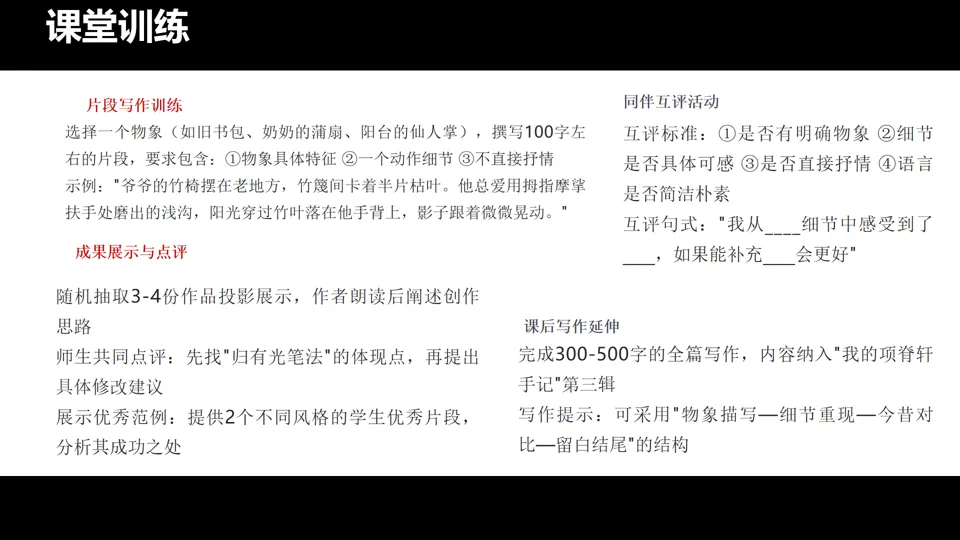 学生写作时“情感泛滥”,缺乏细节 | 引导学生回归归有光的笔法:不直接抒情,用细节说话。提供“升格示例”进行对比,强化“藏情”意识。 |