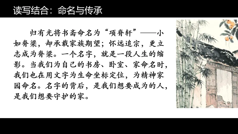 全班交流与教师引导:教师追问——“这个空间对你意味着什么?未来当你离开家,它会成为你的‘项脊轩’吗?”“你的名字背后,是否有像归有光那样的三重意义——低矮如什么?根在何处?志在何方?”