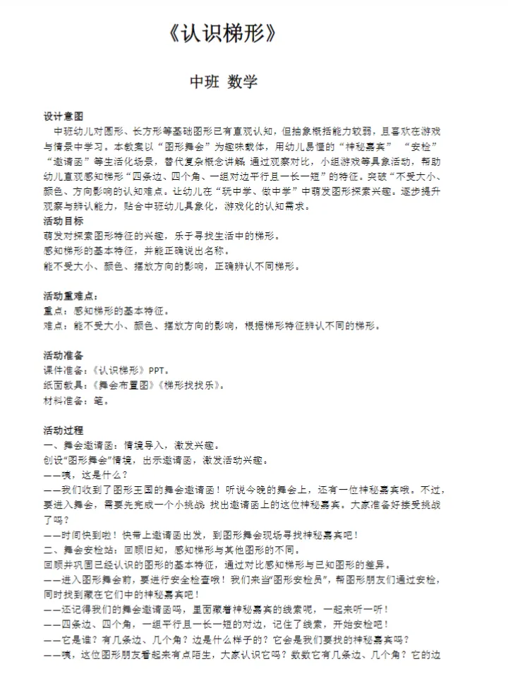 幼儿园中班数学公开课《认识梯形》教案+课件+说课稿