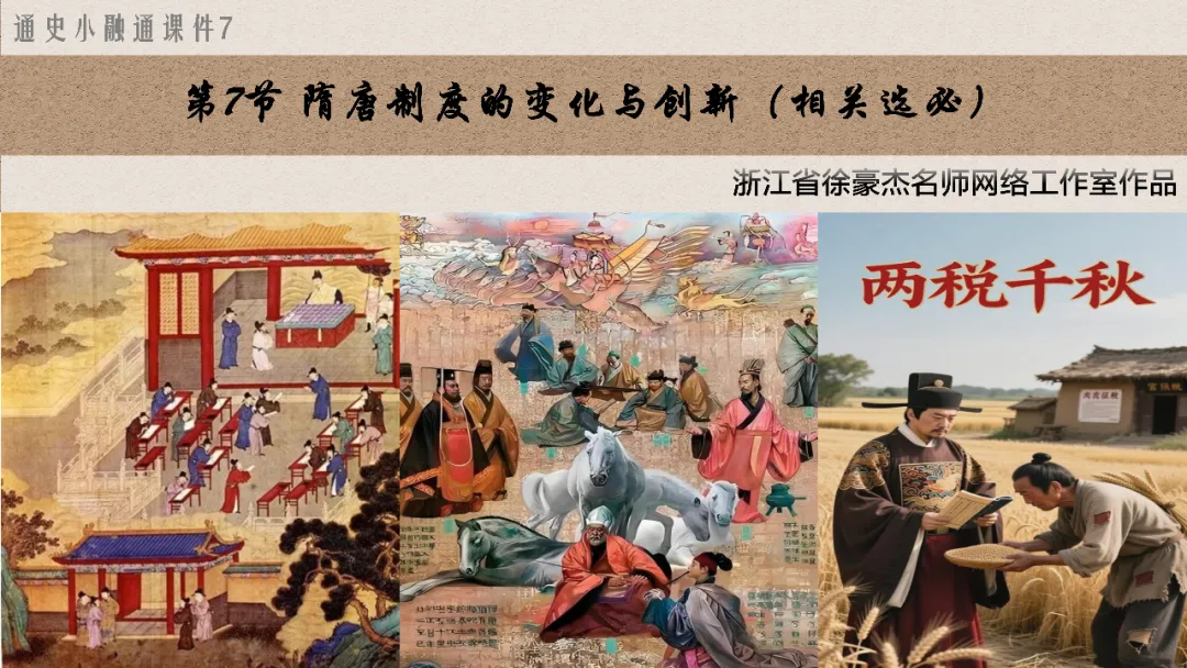 编者按:浙江省徐豪杰名师网络工作室集全室之力编写的选考复习教辅用书——《睛点书理•通史小融通》已经通过浙江省中小学教辅材料评议委员会专家组评议,入选浙江省教育厅教辅评议目录,由新华书店发行(新华目录序号:上册6694;下册6695)。本套教辅原有配套课件由南太湖团队精心制作(甲件),现本工作室正制作全新一套配套课件(乙件),陆续上传分享在工作室网站上(路径:工作室网站——教学资源——工作室开发的通史小融通)。本期推出由杭州师范大学附属中学汤雨曦老师制作的乙件第7个课件《第7节 隋唐制度的变化与创新(相关选必)》。