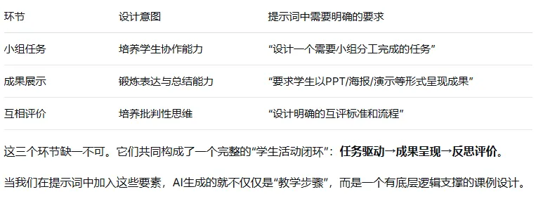 关于这种类型的课例,如果你参加过教学评比,应该知道评委最看重的是什么——不是老师讲得多精彩,而是**学生是否真正参与了学习过程**。“以学生为主体”不是一句口号,它需要落实到具体的课堂环节中。目前主流的获奖课例,通常包含三个核心环节:02 提示词进阶:从“写教案”到“设计获奖课例”