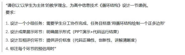 > “请你以‘以学生为主体’的理念,为高中信息技术《循环结构》设计一节课例。> 1. 设计一个小组任务:需要学生分工协作完成,任务目标是‘用循环结构绘制一个正六边形’> 2. 设计成果展示环节:明确展示形式(PPT演示+代码运行结果)AI输出(节选)