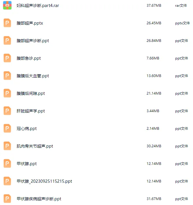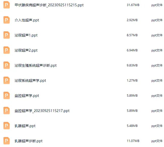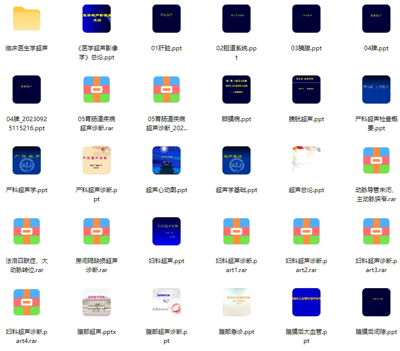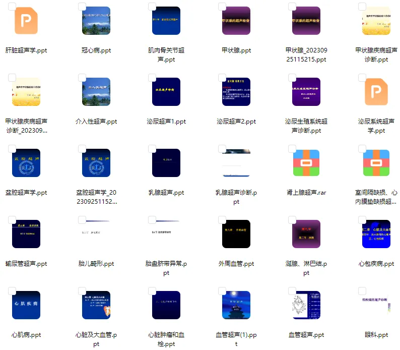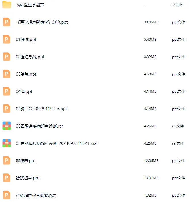 精品超声PPT,包含肝脏、胆道、胰腺、脾脏、胃肠道、妇科、产科、心脏、血管、肌骨等141套课件,涵盖超声基础、各系统疾病诊断及临床应用。