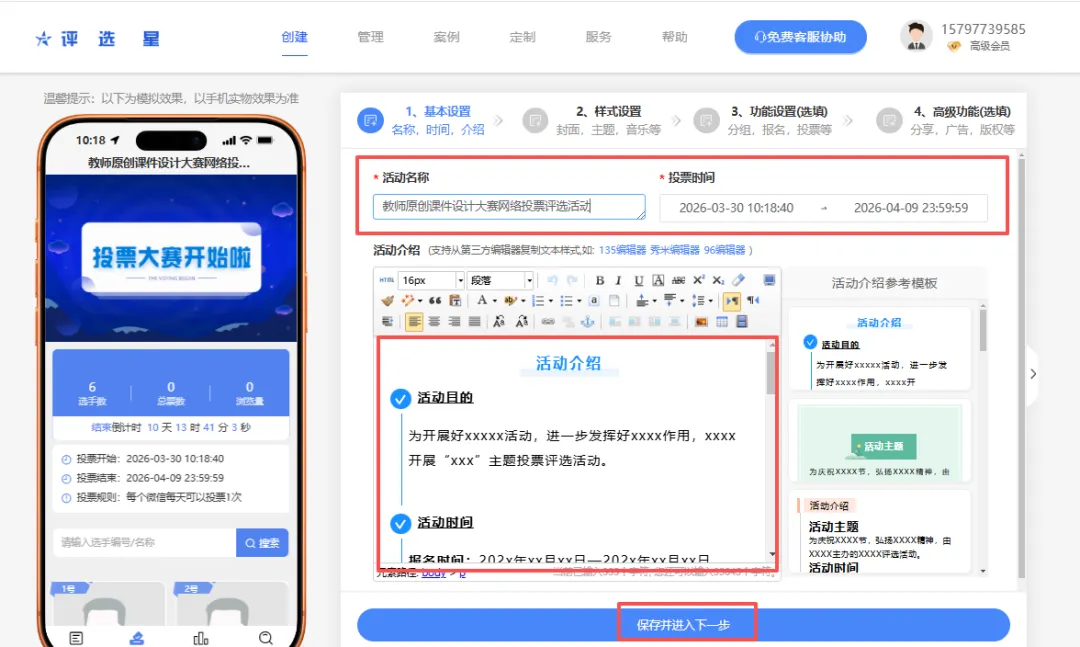 2、在【基本设置】界面的活动名称输入“教师原创课件设计大赛网络投票评选活动”,并设置投票和填写活动介绍。