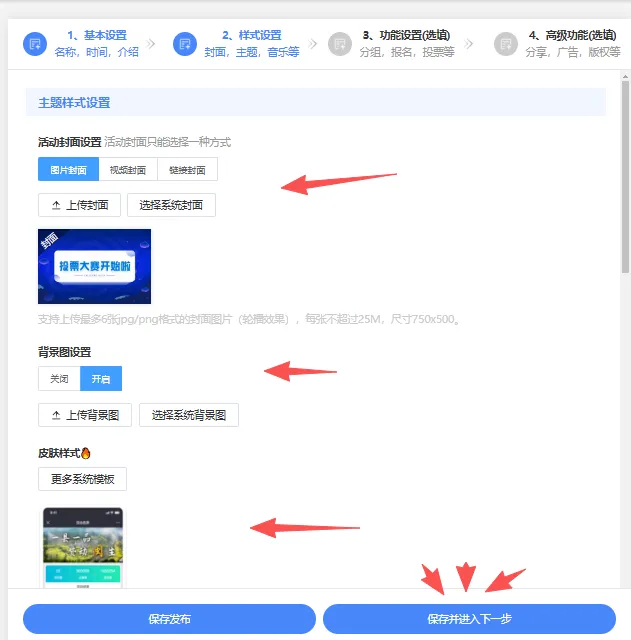3、想要让本次投票评选活动的封面、背景和音乐等更加有特色吸引人,可以通过【样式设置】界面进行修改,完成后记得点击【保存并进入下一步】。