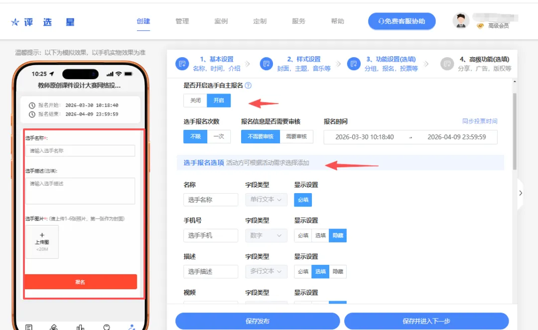 4、通过开启【功能设置】里的选手自主报名,可添加选手的各项资料信息,还能够对投票规则进行设置,来有效拦截机器刷票与恶意水军,保障投票公平有序。