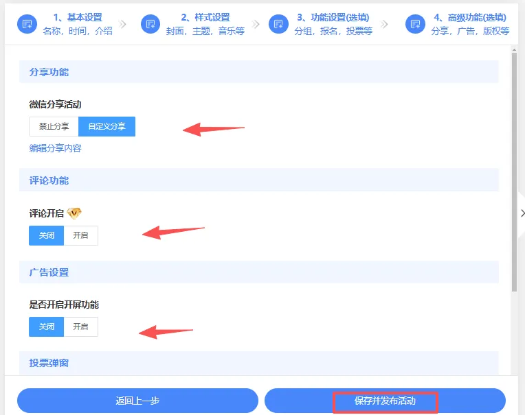 5、接着可在【高级功能】界面选择开启诸如分享、评论、屏蔽等其他额外功能。
