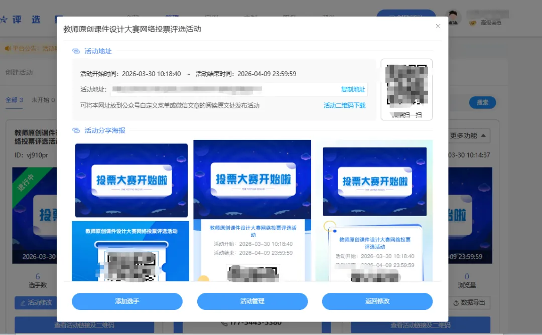 6、完成以上步骤后,评选星平台会自动生产专属的链接、二维码以及宣传海报,方便大家去各大平台转发宣传本次投票评选活动。