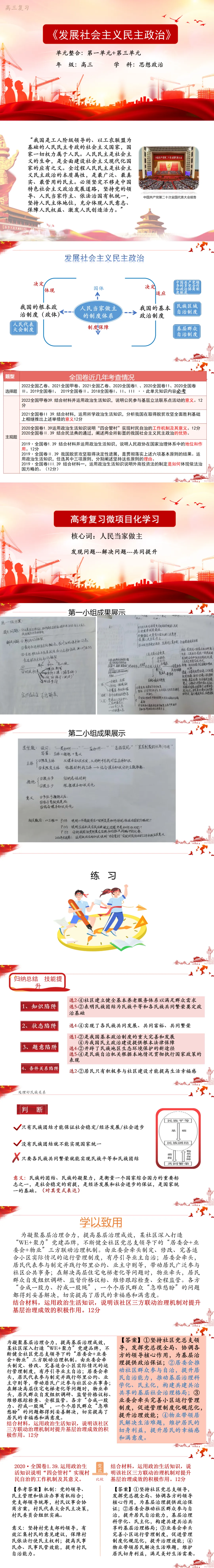 上文我详述了在高三复习如何应用项目式学习进行复习并取得的良好复习效果。本篇就把当时上课的课件分享。课件有点旧,2023年的,但复习内容是政治生活,在高考中对政治生活的重点内容和考查方式变化不算太大,所以觉得还有参考的价值吧。嗯嗯,教法还是很新很有参考意义,希望能对大家有所启发。(觉得课件太简单,看不出所以然,请关注公众号,移步上一篇文章,去那里寻宝···) 在本节课上,课件是预设,但很多的东西是现场利用希沃大屏进行动态展示、分析和生成的,包括在5道选择题练习中学生进行现场提问,我现场答疑;学生项目展示后,我利用希沃在白板上一边圈画,一边进行总结和点评;后面主观题现场训练中,临时抽取学生答卷,师生一起进行评分和点评。 我想,一节高效的复习课应该是生有所呼、师有所应的。关注和聚焦学生的复习问题,就能够对问题做出及时的反馈,也便于学生对自己的复习做评估和调整。高三不易,望皆有所获!祝福!