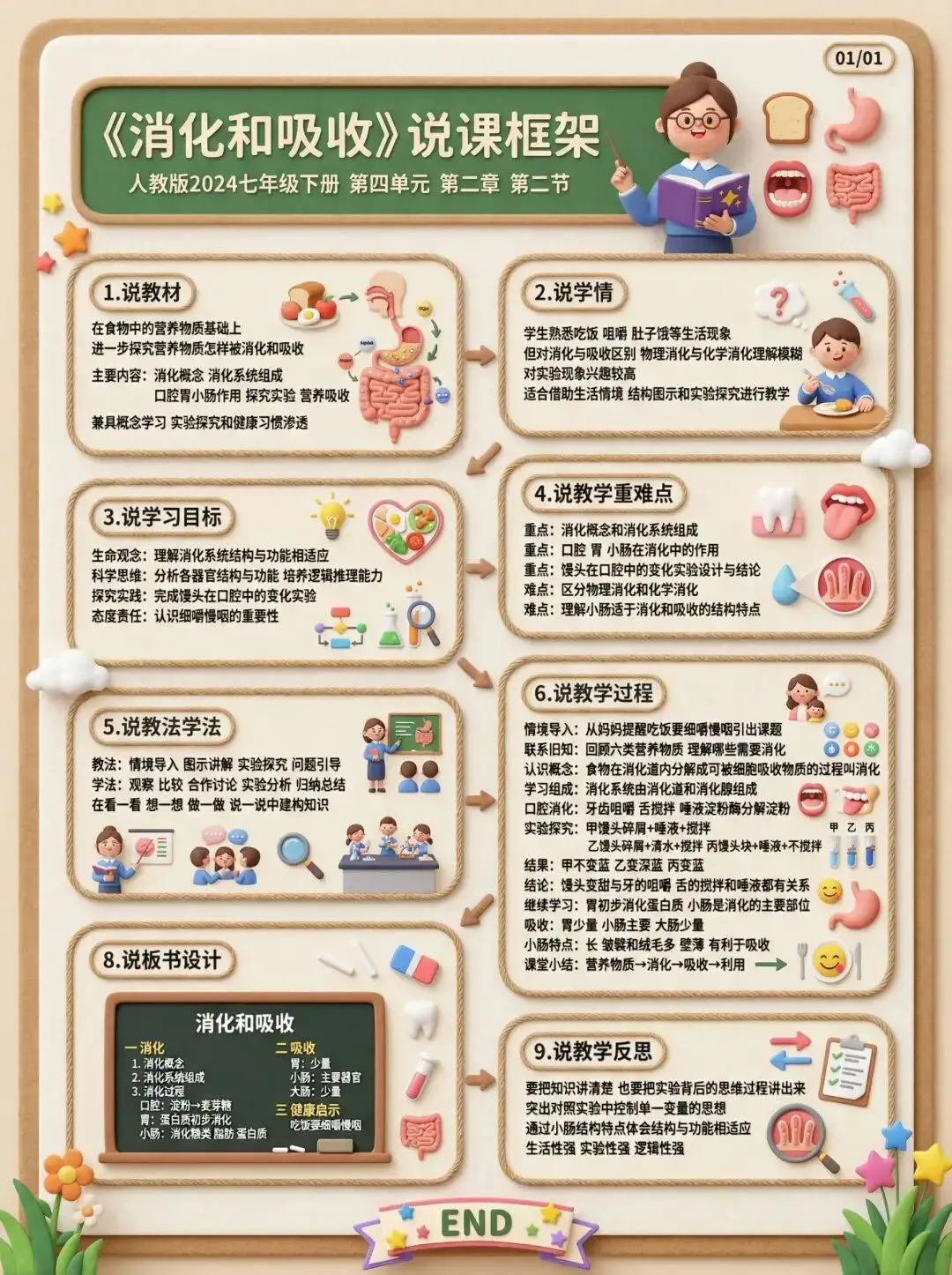 这一期为大家带来的是人教版2024七年级下册第四单元第二章第二节《消化和吸收》的课件配套说课思路。本节课内容与学生生活联系非常紧密,从“吃饭为什么要细嚼慢咽”这一熟悉情境出发,引导学生认识消化的概念,梳理消化系统的组成,并通过“馒头在口腔中的变化”实验,理解牙齿、舌和唾液在口腔消化中的作用。同时,课件还进一步呈现了胃和小肠在消化中的功能,以及小肠适于吸收营养物质的结构特点,帮助学生建立“结构与功能相适应”的生物学观念。