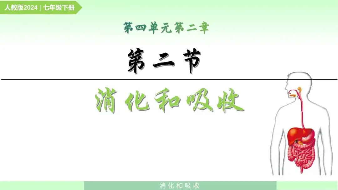 《消化和吸收》是人教版2024七年级下册第四单元第二章第二节的内容。本节课是在学生已经学习“食物中的营养物质”的基础上,进一步探究这些营养物质是怎样被人体消化并吸收利用的。课件内容主要包括五个层次:一是消化的概念;二是消化系统的组成;三是口腔、胃、小肠等器官在消化过程中的作用;四是“馒头在口腔中的变化”探究实验;五是营养物质的吸收及小肠适于吸收的结构特点。整节课既有概念学习,也有实验探究,还有健康习惯渗透,综合性较强。