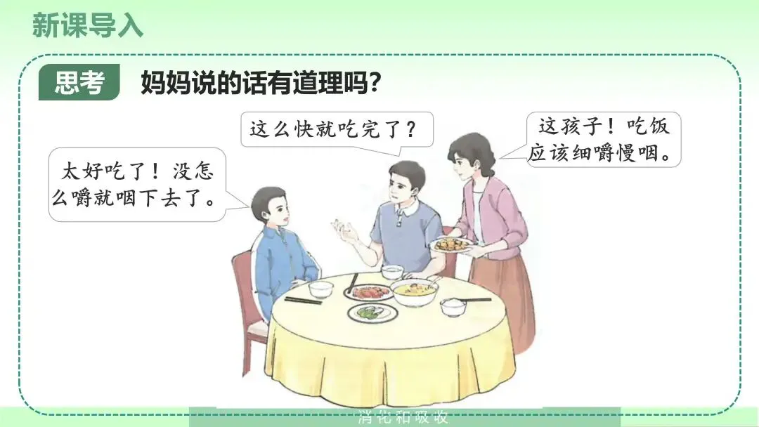 我会先出示课件中的生活情境:孩子吃饭很快,妈妈提醒“吃饭应该细嚼慢咽”。然后提出问题:“妈妈说的话有道理吗?”由此引导学生思考,为什么吃饭不能狼吞虎咽,从而自然导入“消化和吸收”这一课题。这样的导入贴近学生生活,容易激发兴趣。