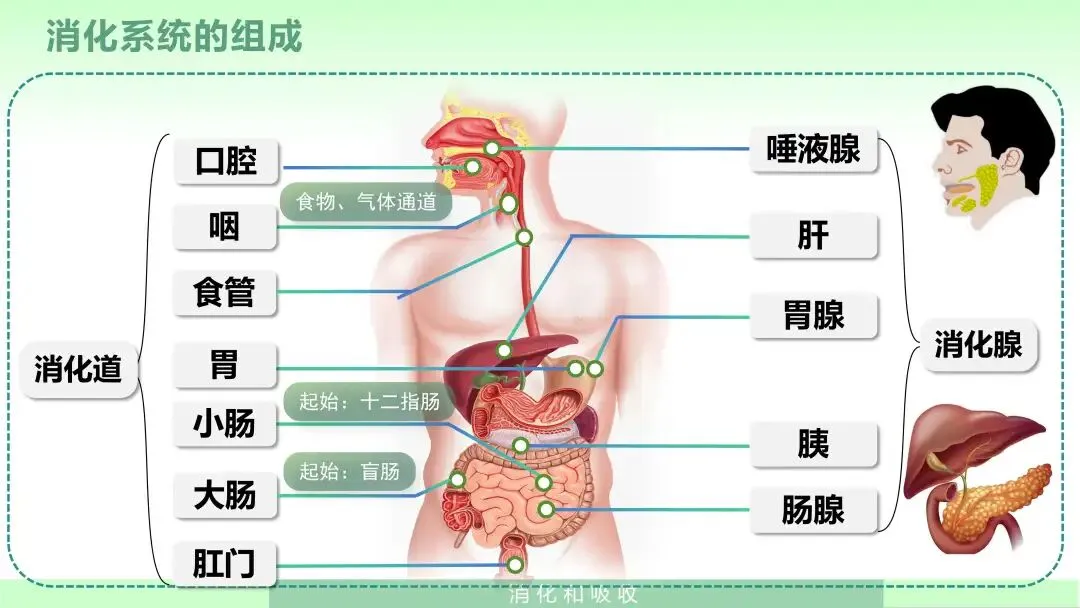然后利用课件中的人体消化系统结构图,引导学生认识消化系统由消化道和消化腺组成。消化道包括口腔、咽、食管、胃、小肠、大肠和肛门;消化腺包括唾液腺、胃腺、肝、胰和肠腺。这里要特别提醒学生:咽和食管主要起通道作用,没有消化功能。