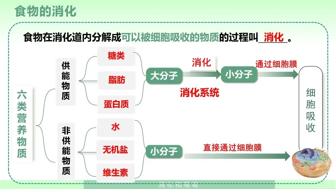 在这一环节中,我先带领学生回顾上一节课学习过的六类营养物质,即糖类、脂肪、蛋白质、水、无机盐和维生素。然后顺势提出问题:“这些营养物质是不是都能直接被细胞利用?”引导学生观察课件中的示意图,认识到糖类、脂肪和蛋白质属于大分子物质,需要经过消化才能变成可以被细胞吸收的小分子;而水、无机盐和维生素本身是小分子,可以直接通过细胞膜。随后我引出消化的概念:食物在消化道内分解成可以被细胞吸收的物质的过程叫作消化。这样就实现了由旧知向新知的自然过渡。