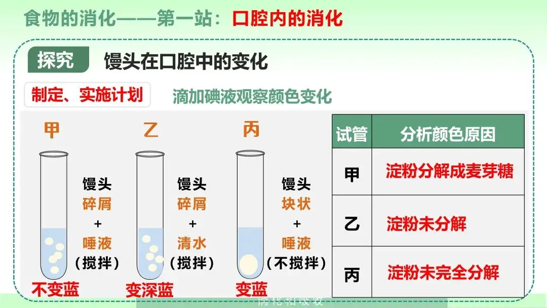 实验结束后,我带领学生观察现象:滴加碘液后,甲试管不变蓝,乙试管变深蓝,丙试管变蓝。接着组织学生分析原因:甲说明淀粉已经被分解成麦芽糖;乙说明没有唾液时,淀粉不能被分解;丙说明缺少充分咀嚼和搅拌时,淀粉不能完全分解。最后得出实验结论:馒头变甜与牙的咀嚼、舌的搅拌以及唾液都有关系,淀粉在口腔中被唾液中的唾液淀粉酶分解成麦芽糖。实验之后,我再进一步追问:“为什么要用37℃温水保温?”引导学生回答:因为这是在模拟人体口腔温度。至此,学生就能比较完整地理解口腔中的消化过程。