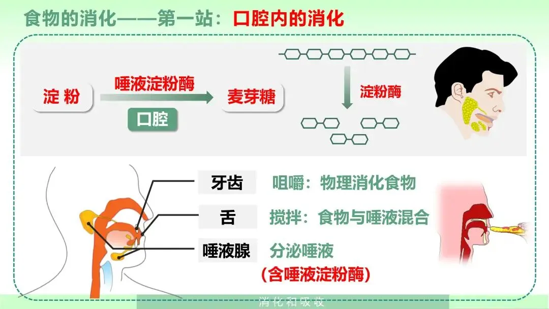 接下来进入本课重点内容——口腔内的消化。通过课件图示说明:牙齿的作用是咀嚼食物,属于物理消化;舌的作用是搅拌,使食物与唾液充分混合;唾液腺分泌唾液,唾液中含有唾液淀粉酶,能够把淀粉分解成麦芽糖。这里要帮助学生初步建立“口腔不仅能机械处理食物,还能进行初步化学消化”的认识。