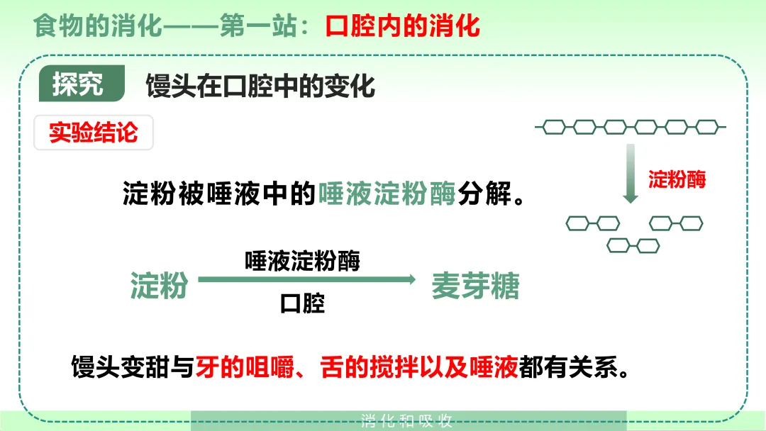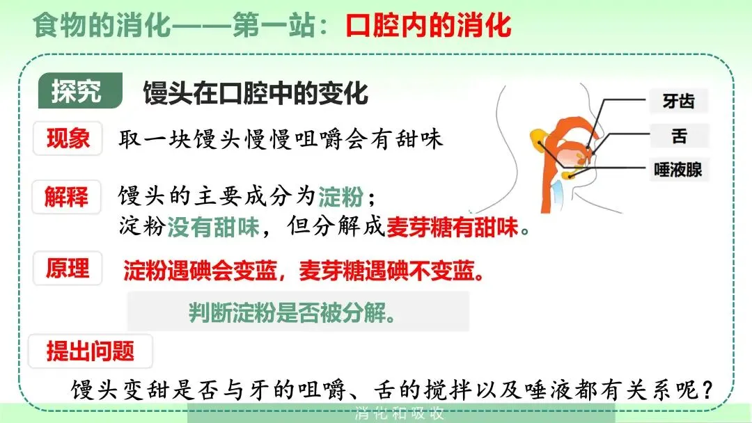 这一环节是本节课的核心内容。首先,我带领学生观察课件,明确口腔中的三类结构及其作用:牙齿负责咀嚼,把食物切断、磨碎,属于物理性消化;舌负责搅拌,促进食物与唾液充分混合;唾液腺分泌唾液,唾液中含有唾液淀粉酶,能够将淀粉分解为麦芽糖,这属于化学性消化。接着我会出示“慢慢咀嚼馒头会有甜味”的现象,引导学生思考原因。学生在分析中会发现,馒头的主要成分是淀粉,淀粉本身没有甜味,但分解产生的麦芽糖有甜味;同时,淀粉遇碘液会变蓝,而麦芽糖遇碘液不变蓝,因此可以通过滴加碘液来判断淀粉是否被分解。