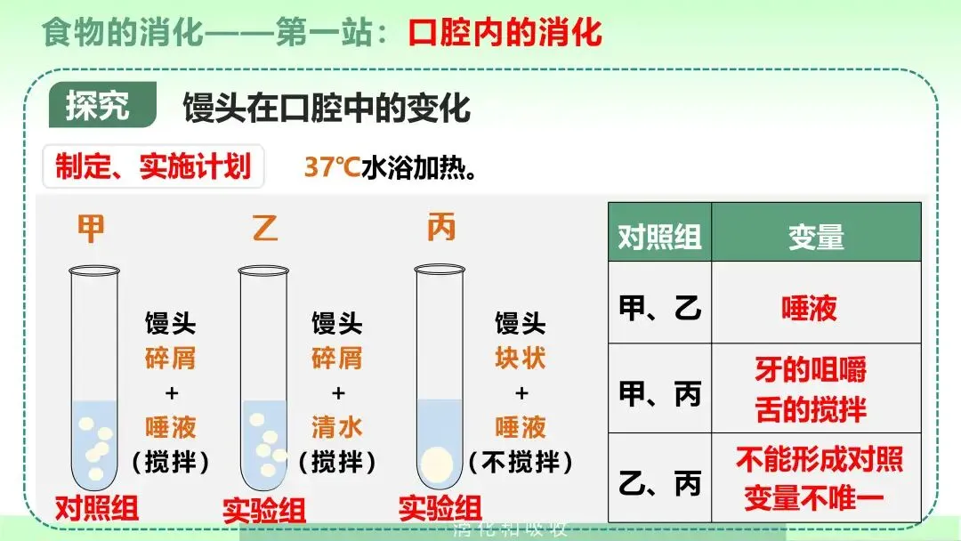 在实验设计环节,课件设置了三支试管:甲试管为馒头碎屑加唾液并搅拌,乙试管为馒头碎屑加清水并搅拌,丙试管为馒头块状加唾液但不搅拌,并都置于37℃水浴中。通过比较甲乙,探究唾液的作用;通过比较甲丙,探究牙的咀嚼和舌的搅拌的作用;同时指出乙丙不能形成对照,因为变量不唯一。这里可以重点训练学生的对照实验意识。