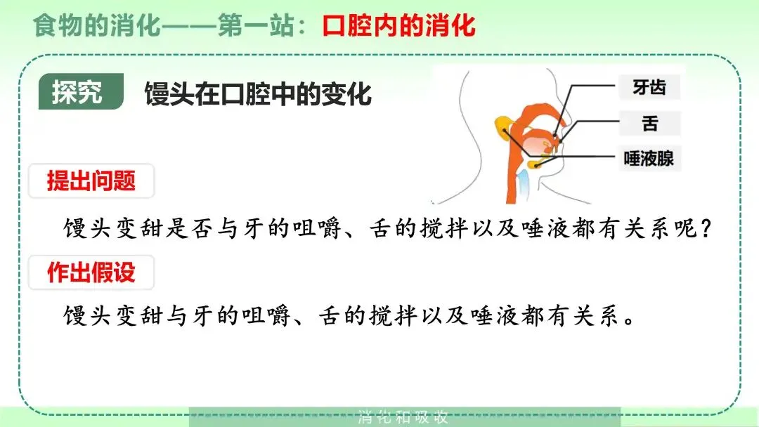 接着,引导学生提出问题:馒头变甜是否与牙的咀嚼、舌的搅拌以及唾液都有关系呢?再作出假设:馒头变甜与牙的咀嚼、舌的搅拌以及唾液都有关系。