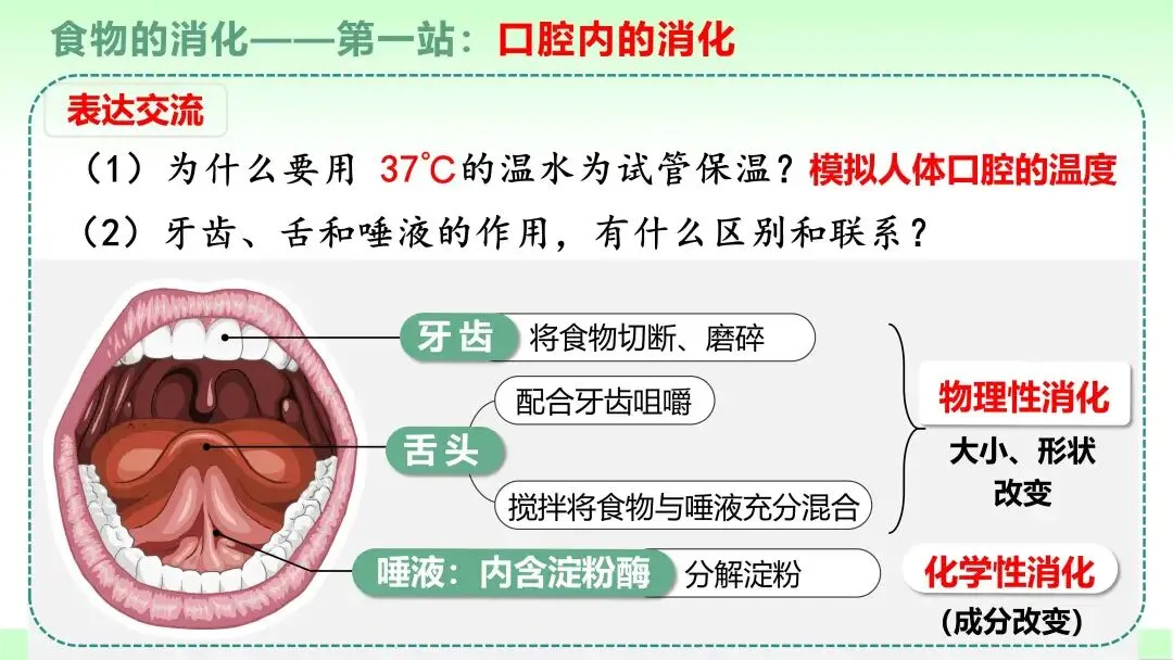 在实验分析之后,我还会继续追问两个问题:为什么要用37℃温水保温?因为这是在模拟人体口腔温度。牙齿、舌和唾液的作用有什么区别和联系?从而帮助学生归纳:牙齿切断、磨碎食物,舌搅拌混合,唾液中的酶分解淀粉,三者协同完成口腔中的初步消化。
