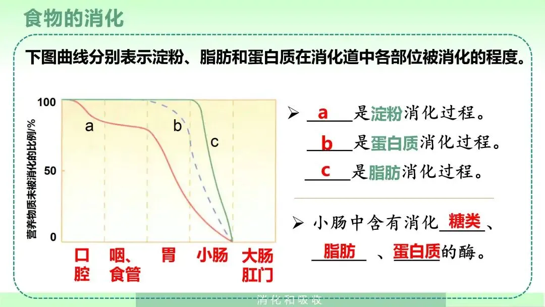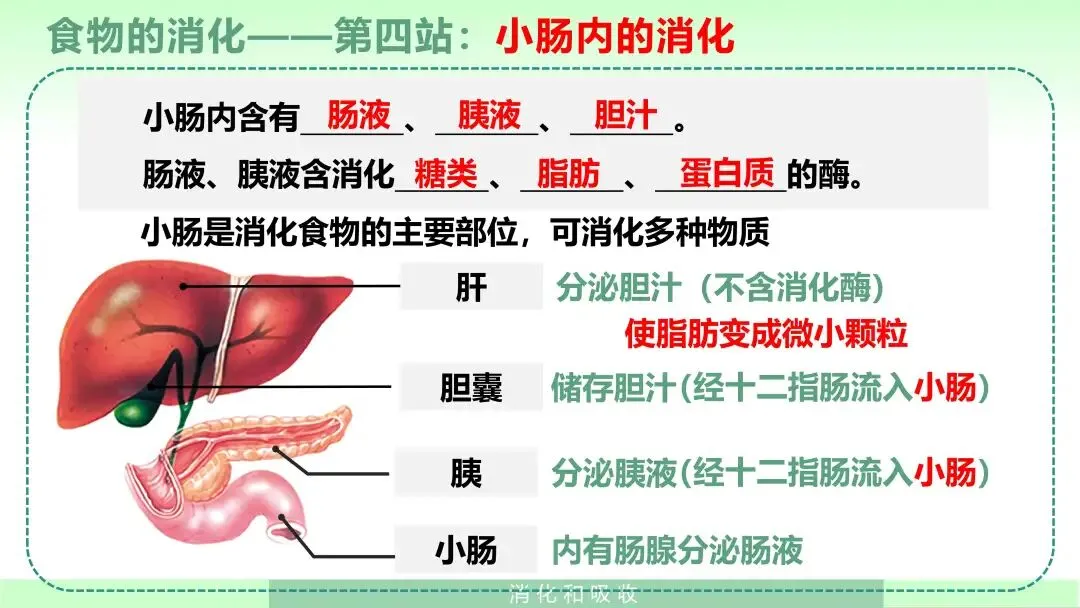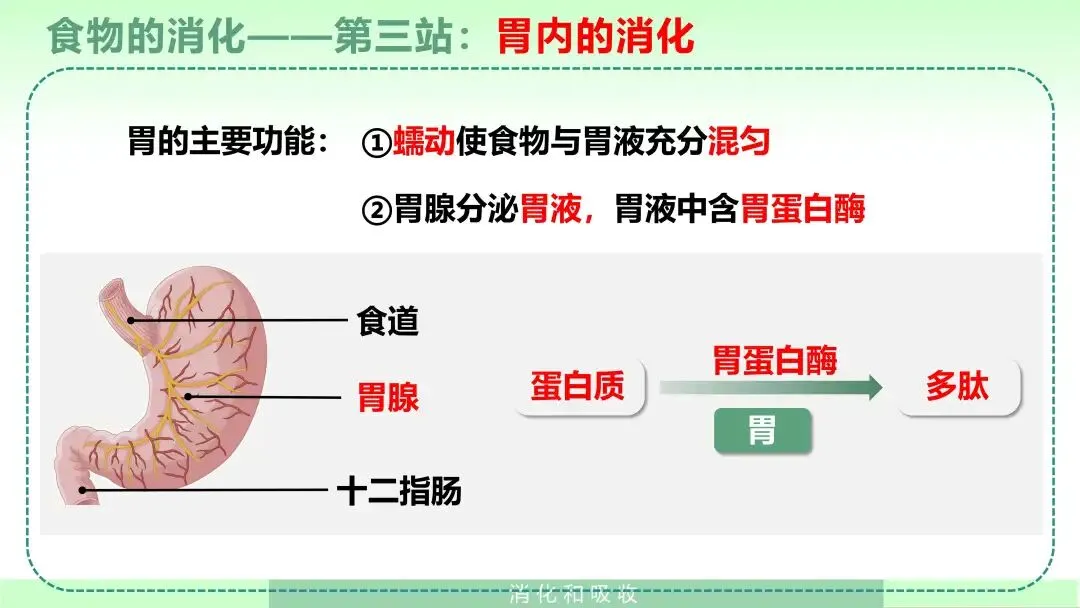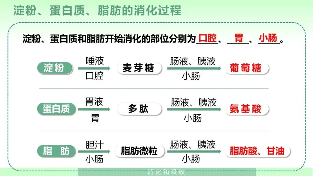 在学生理解口腔内消化之后,我继续借助课件讲解后续消化过程。咽和食管没有消化功能,只是通过吞咽和蠕动把食物送入胃。胃的主要功能有两个,一是通过蠕动使食物与胃液充分混匀,二是胃腺分泌胃液,胃液中含有胃蛋白酶,可以将蛋白质初步分解为多肽。小肠则是消化食物的主要部位,因为小肠内有肠液、胰液和胆汁,其中肠液和胰液含有消化糖类、脂肪和蛋白质的酶,而胆汁虽然不含消化酶,但能够把脂肪变成微小颗粒,便于进一步消化。课件还明确指出,淀粉、蛋白质和脂肪开始消化的部位分别是口腔、胃和小肠,这一点我也会带领学生及时归纳。