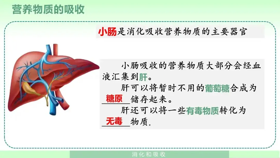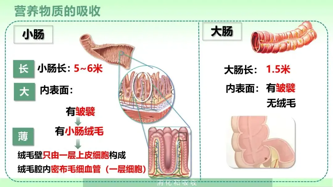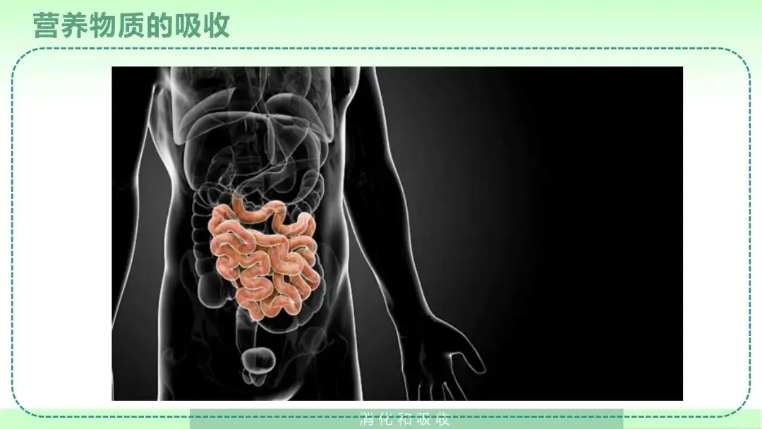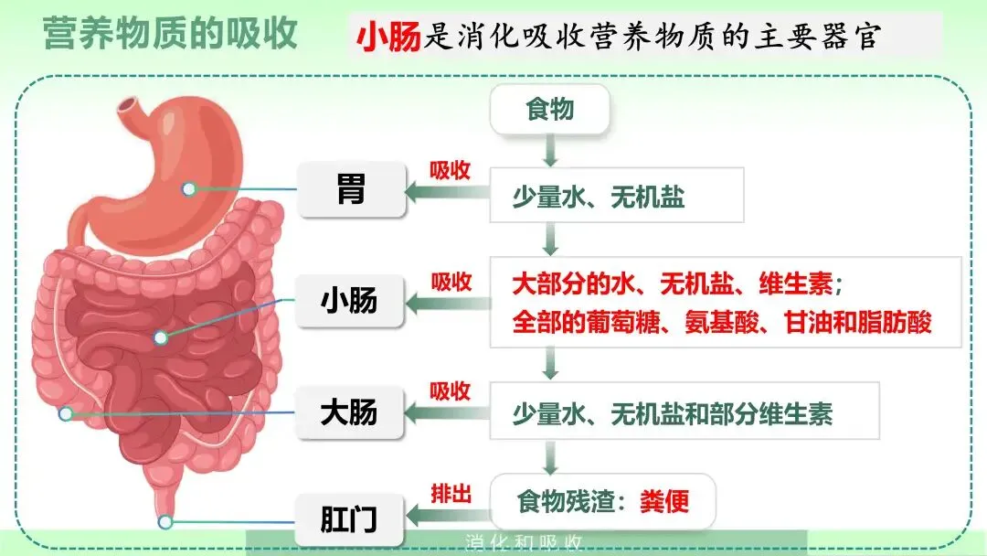 在讲完消化之后,自然过渡到吸收。根据课件内容,我会引导学生知道:胃能吸收少量水和无机盐;小肠能吸收大部分水、无机盐、维生素以及全部葡萄糖、氨基酸、甘油和脂肪酸;大肠能吸收少量水、无机盐和部分维生素,因此小肠是消化和吸收营养物质的主要器官。