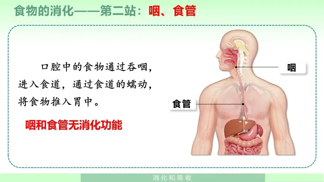 在学生理解口腔消化后,我会继续按照课件逻辑讲解后续消化过程。咽和食管只负责运输食物,没有消化功能。胃通过蠕动使食物与胃液充分混合,胃液中含胃蛋白酶,可以初步消化蛋白质。小肠中有肠液、胰液和胆汁,其中肠液和胰液中含有消化糖类、脂肪和蛋白质的酶,胆汁虽然不含消化酶,但能把脂肪变成微小颗粒,因此小肠是消化食物的主要部位。