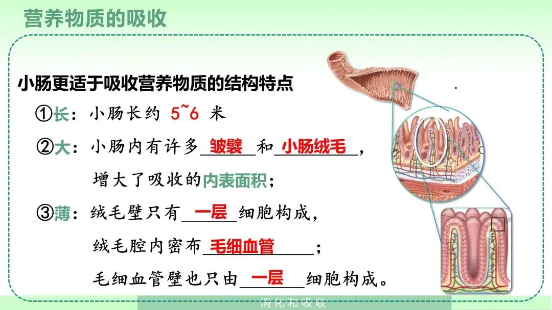 在学习“吸收”时,我会引导学生认识:胃可以吸收少量水和无机盐;小肠能够吸收大部分水、无机盐、维生素,以及全部的葡萄糖、氨基酸、甘油和脂肪酸;大肠则吸收少量水、无机盐和部分维生素。因此,小肠是消化和吸收营养物质的主要器官。接着,我重点分析小肠适于吸收的结构特点:第一,小肠很长,约5到6米;第二,小肠内表面有许多皱襞和小肠绒毛,大大增大了吸收面积;第三,绒毛壁和毛细血管壁都只由一层细胞构成,结构很薄,有利于营养物质迅速进入血液。通过这一部分,帮助学生真正建立“结构与功能相适应”的生物学观念。
