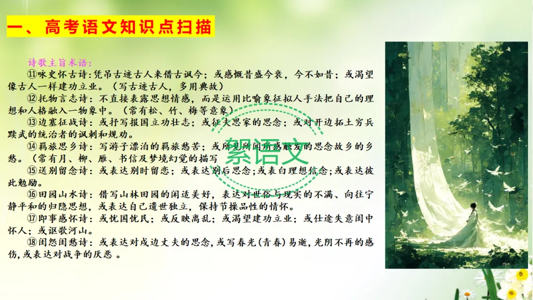 ⑱闺怨闺愁诗:或表达对戍边丈夫的思念,或写春光(青春)易逝,光阴不再的感伤,或表达对战争的厌恶。(我们认为不会考,但是课本中有,我们还是要了解一点。)