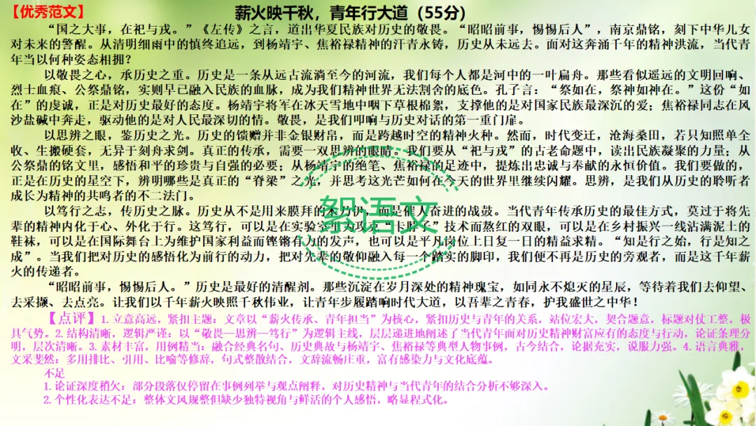 1.论证深度稍欠:部分段落仅停留在事例列举与观点阐释,对历史精神与当代青年的结合分析不够深入。