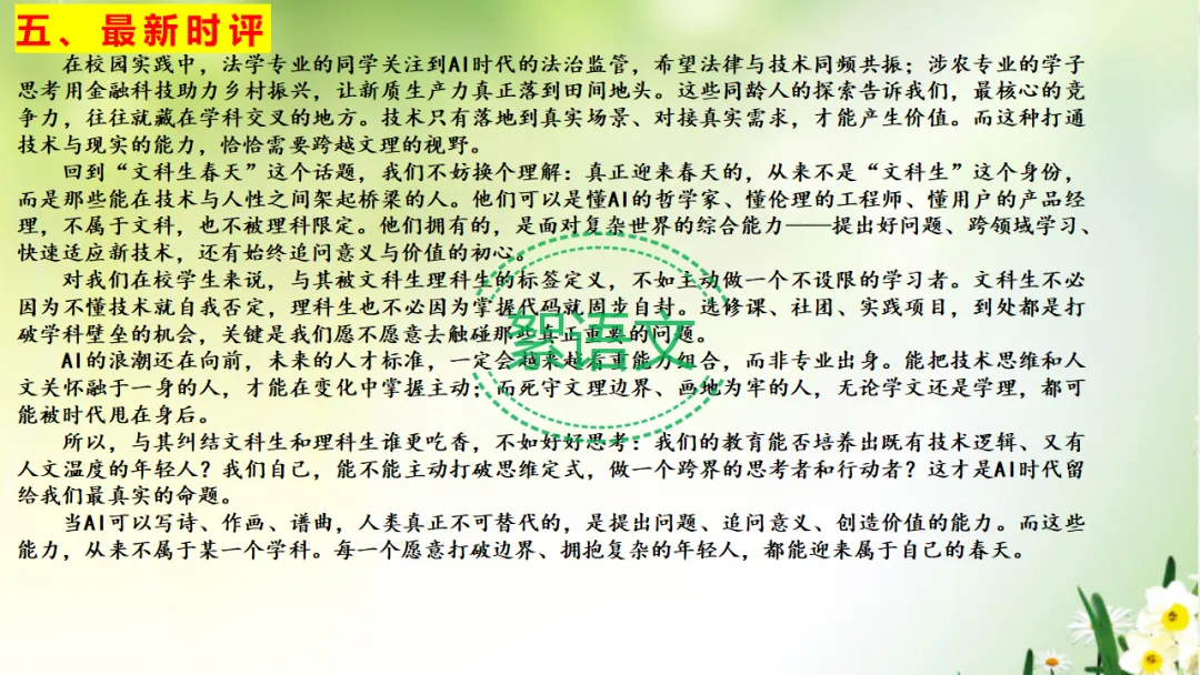 回到“文科生春天”这个话题,我们不妨换个理解:真正迎来春天的,从来不是“文科生”这个身份,而是那些能在技术与人性之间架起桥梁的人。他们可以是懂AI的哲学家、懂伦理的工程师、懂用户的产品经理,不属于文科,也不被理科限定。他们拥有的,是面对复杂世界的综合能力——提出好问题、跨领域学习、快速适应新技术,还有始终追问意义与价值的初心。
