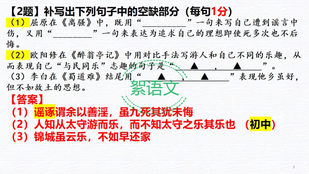 (1)屈原在《离骚》中,既用“”一句来写自己遭到谣言中伤,又用“”一句来表达为追求自己的理想即使死多次也不后悔。
