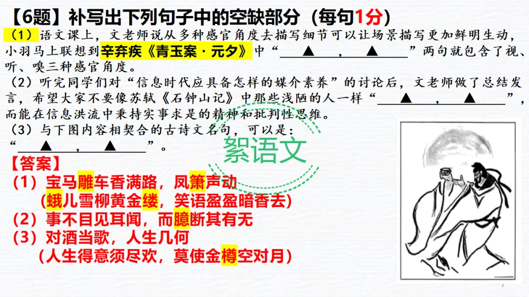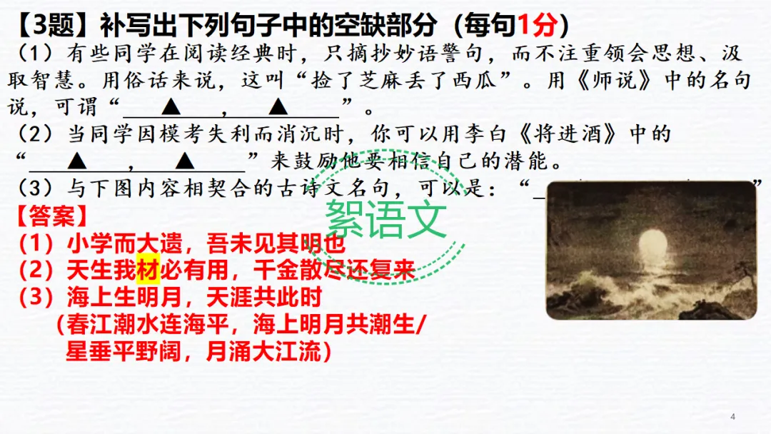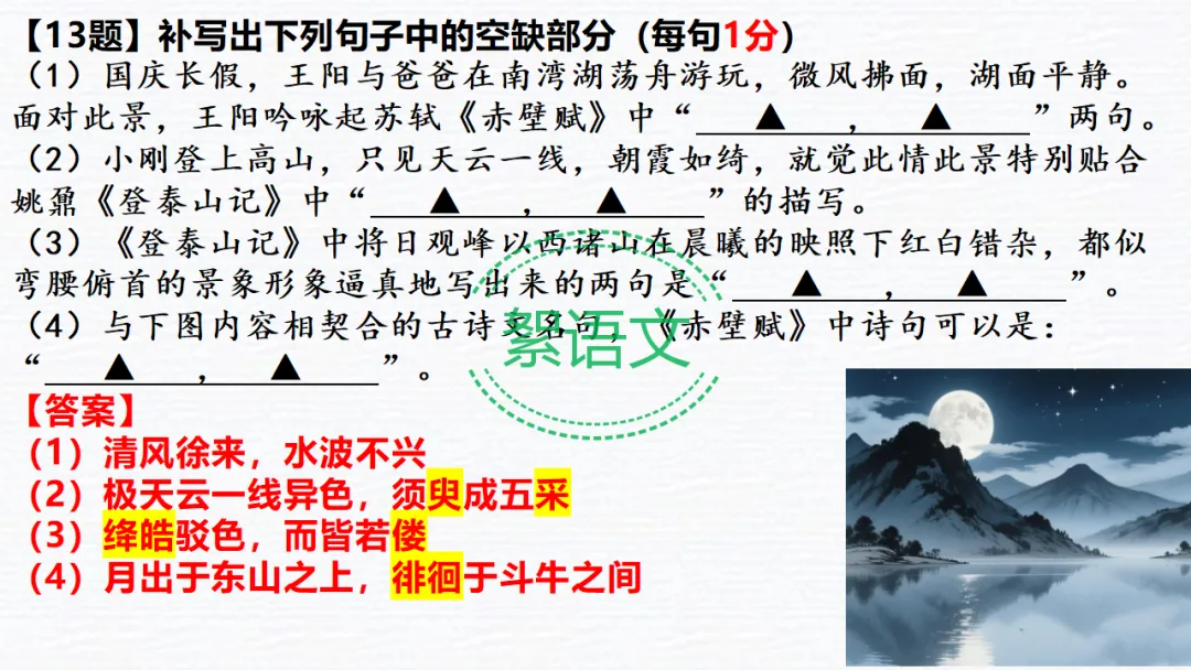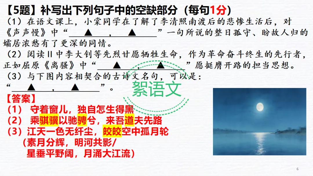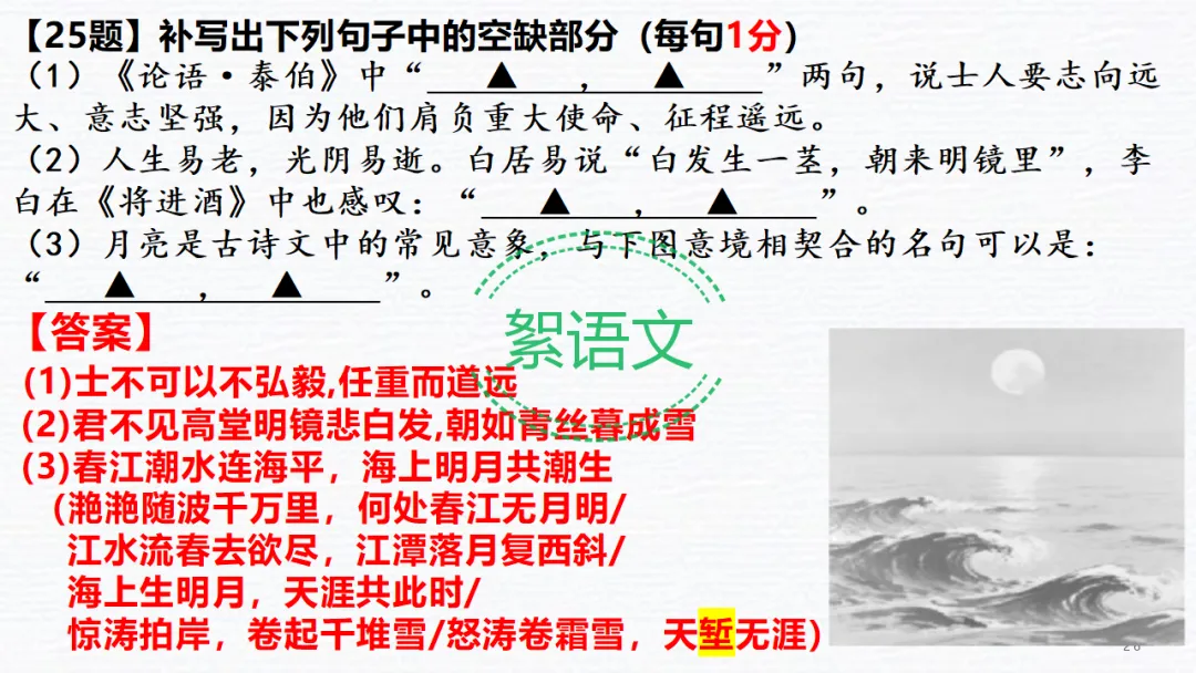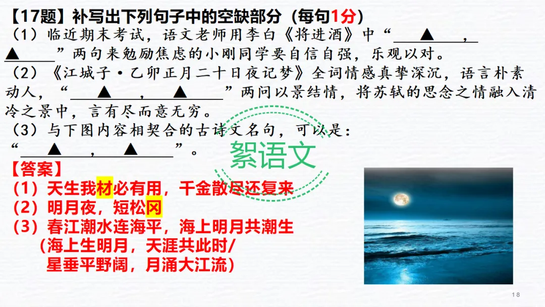 (3)月亮是古诗文中的常见意象,与下图意境相契合的名句可以是:“,。”