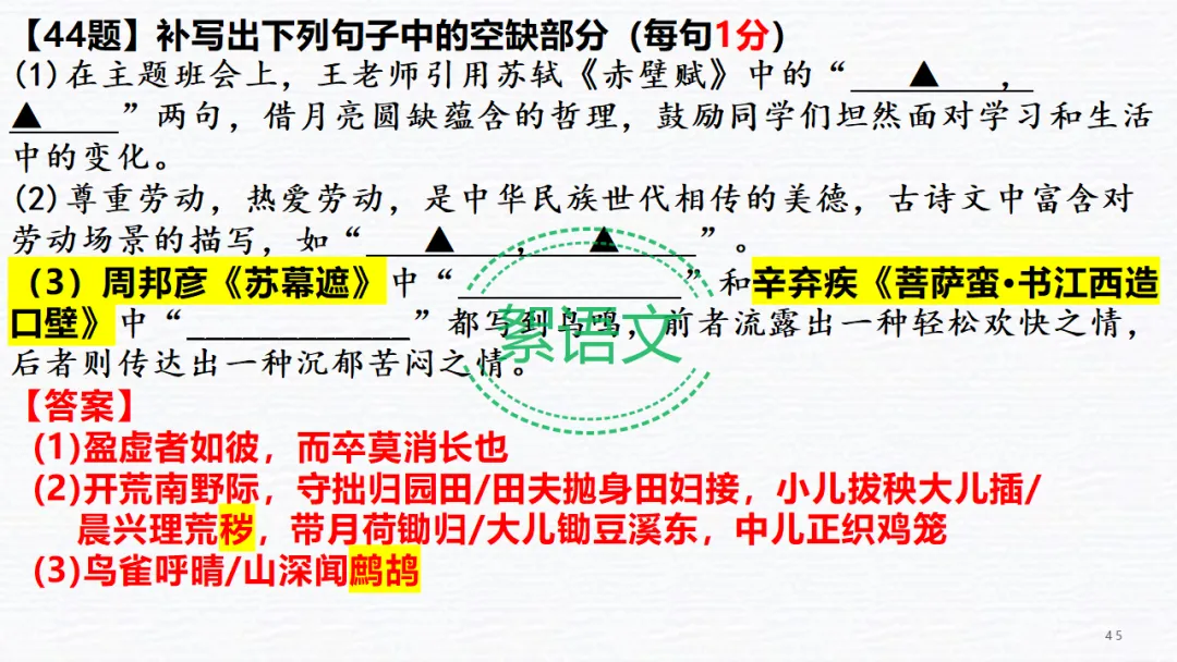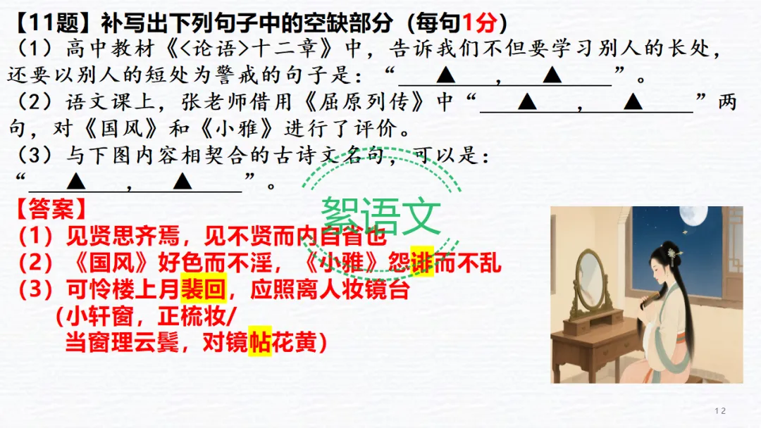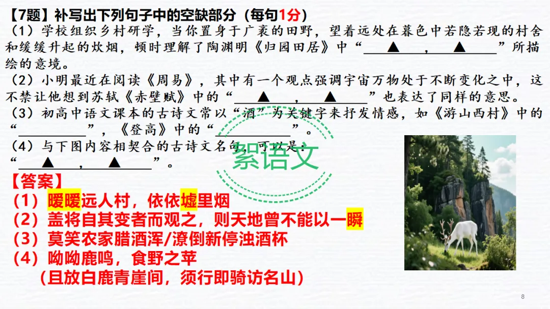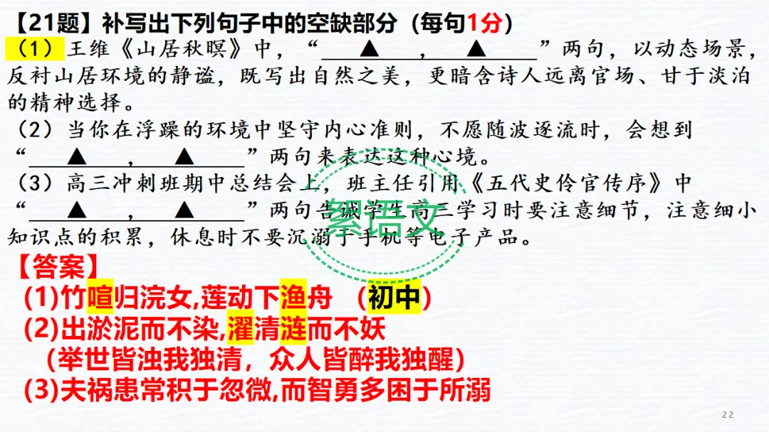(1)王维《山居秋暝》中,“,”两句,以动态场景,反衬山居环境的静谧,既写出自然之美,更暗含诗人远离官场、甘于淡泊的精神选择。
