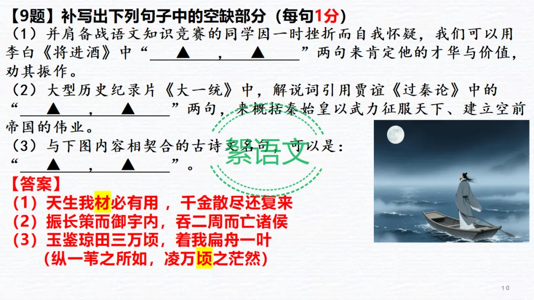 (2)当同学因模考失利而消沉时,你可以用李白《将进酒》中的“,