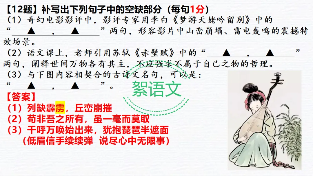 (1)奇幻电影影评中,影评专家用李白《梦游天姥吟留别》中的“,”两句,形容影片中山峦崩塌、雷电轰鸣的震撼特效场景。