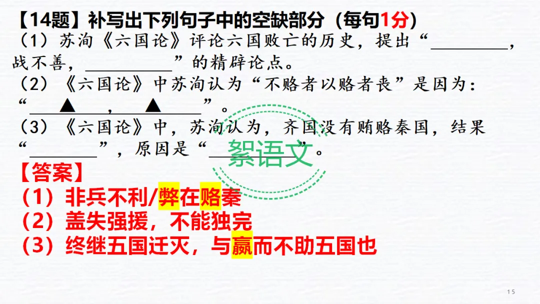 (3)《六国论》中,苏洵认为,齐国没有贿赂秦国,结果“”,原因是“”。