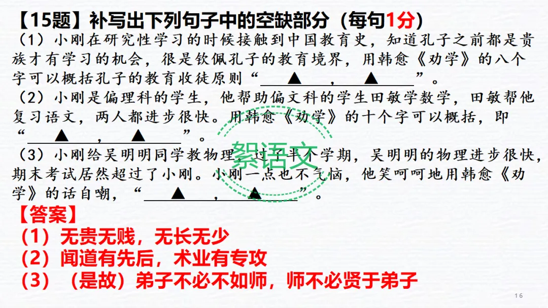 (1)小刚在研究性学习的时候接触到中国教育史,知道孔子之前都是贵族才有学习的机会,很是钦佩孔子的教育境界,用韩愈《师说》的八个字可以概括孔子的教育收徒原则“,”。