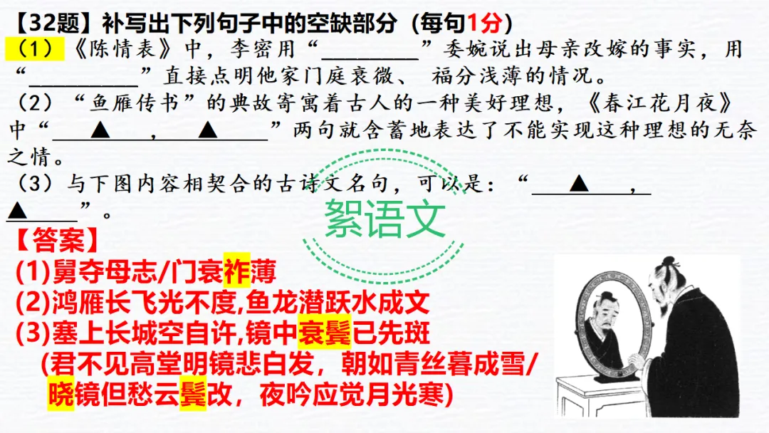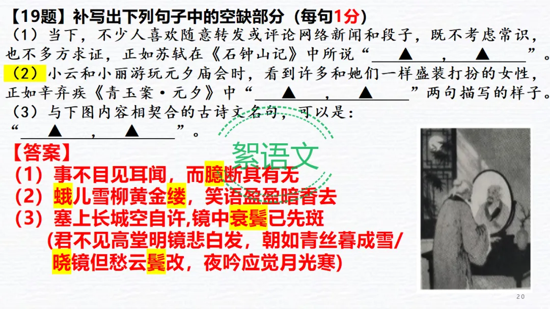(4)小王参观中国古代铜镜文化展,眼前浮现出古代女子对镜梳妆的场景,他情不自禁地吟诵起古诗文中的两句“,”。